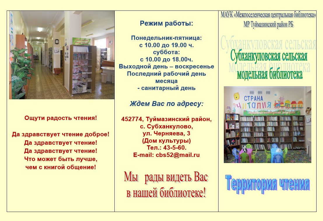22 декабря 2010 года была открыта Субханкуловская сельская модельная библиотека как «Центр досуга». Организует разнообразный досуг населения села, приглашает на встречи с интересными людьми, на обсуждения вопросов семьи и пр. Тесно контактирует с женсоветом села, с советом ветеранов. При библиотеке начинает работать клуб «Берегиня», с 2011 года приступил к работе клуб «Старые друзья», так как библиотека особое внимание уделяет работе с пожилыми людьми. В библиотеке действует школа компьютерной грамотности для пожилых.