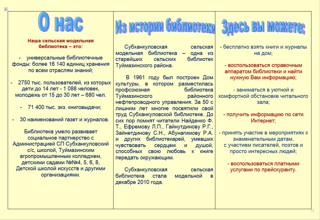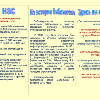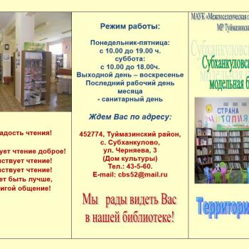 Особое внимание библиотека уделяет краеведческой работе, кропотливо собирается история Субханкулово, оформлен этнографический уголок, который украшают шежере местных жителей, предметы быта. Проходят встречи с местными поэтами, презентации их книг, творческими людьми, различные фольклорные посиделки, праздники родословной, фестивали книги и чтения, участвует в совместных мероприятиях с Домом культуры, клубом ветеранов «Доверие».